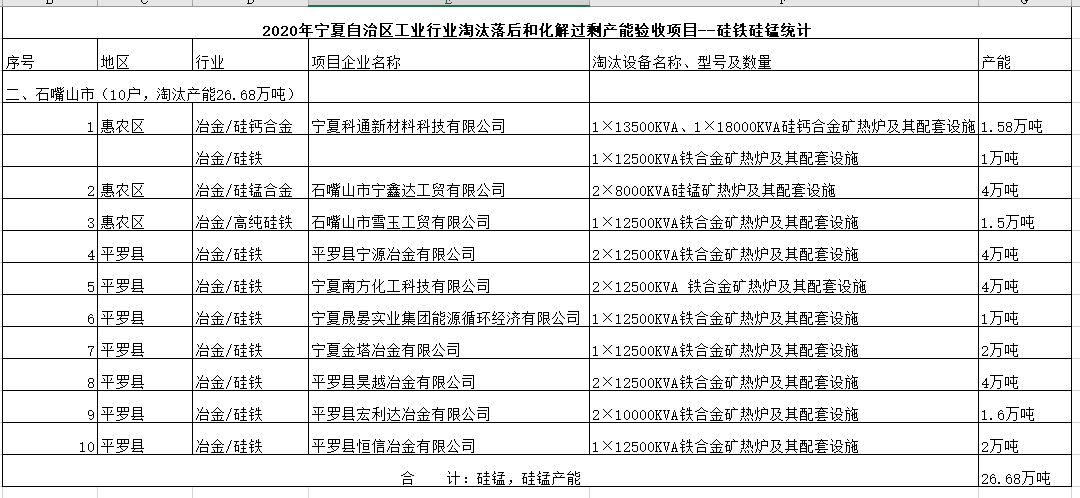 中国铁合金网讯:2021年2月3日,宁夏自治区工信厅发布2020年度自治区工业行业淘汰落后和化解过剩产能验收项目公示名单,本次淘汰落后铁合金产能共计26.68万吨,其中涉及到部分硅锰,硅铁企业名单如下所示: