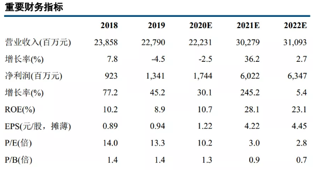 盈利预测和投资建议:我们预估公司2020-2022年的营业收入分别为222.31亿元、302.79亿元和310.93亿元,对应的归母净利润分别为17.44亿元、60.22亿元和63.47亿元,对应的PE分为为10/3/2.8。以2021年的业绩作为估值基准,对应10倍估值,公司合理市值为600亿,对应的股价为42元,维持“买入”评级。