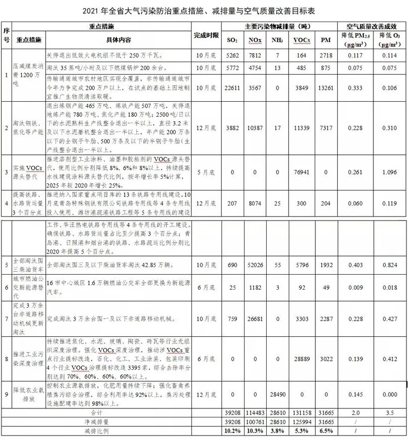 在全省区域内,按照PM2.5浓度每下降1μg/m3需减排17.3万吨污染物,O3浓度每下降1μg/m3需减排7.0万吨污染物,O3浓度下降需减排的VOCs和NOX基本包含在PM2.5减排的污染物削减中,不再单独计算。为确保实现年度空气质量目标,应减少大气污染物排放34.6万吨,需重点采取9大措施。