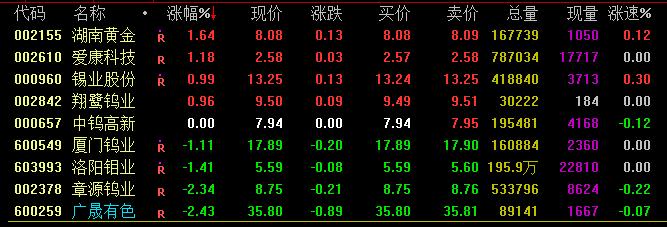 今日,钨上市公司收盘表现涨跌不一,下午收盘后湖南黄金领涨,涨幅1.64%,爱康科技涨幅1.18%,锡业股份涨近1%,翔鹭钨业涨近1%,其中广晟有色领跌,涨近3%,章源钨业跌超2%,中钨高新涨超1%,厦门钨业跌幅1.11%,洛阳钼业跌幅1.41%。