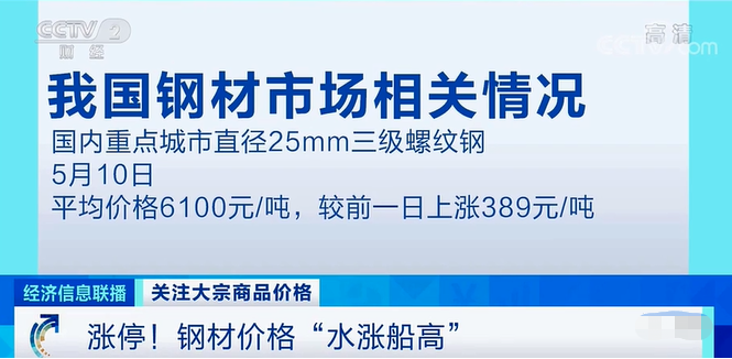 数据显示,5月10日,国内重点城市直径25mm三级螺纹钢平均价格6100元/吨,较前一日上涨了389元/吨。