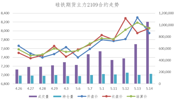 【期货行情】本周硅铁期货盘面高位盘整运行。2109主力合约开盘价7,800,最高价8,548,最低价7,712,收盘价8,062,结算价8,058,成交量3,116,065,持仓量167,542,涨幅4.51%。