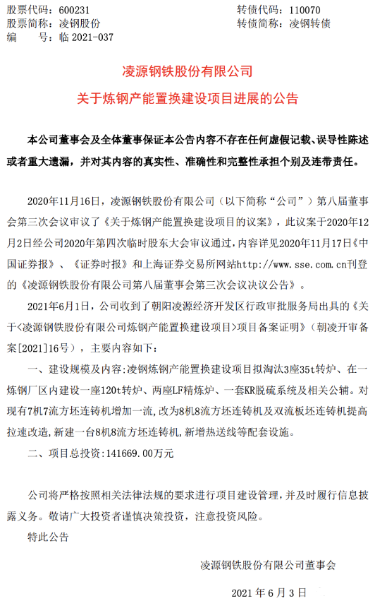 2021年6月1日,公司收到了朝阳凌源经济开发区行政审批服务局出具的《关于〈凌源钢铁股份有限公司炼钢产能置换建设项目〉项目备案证明》(朝凌开审备案[2021]16号),主要内容如下: