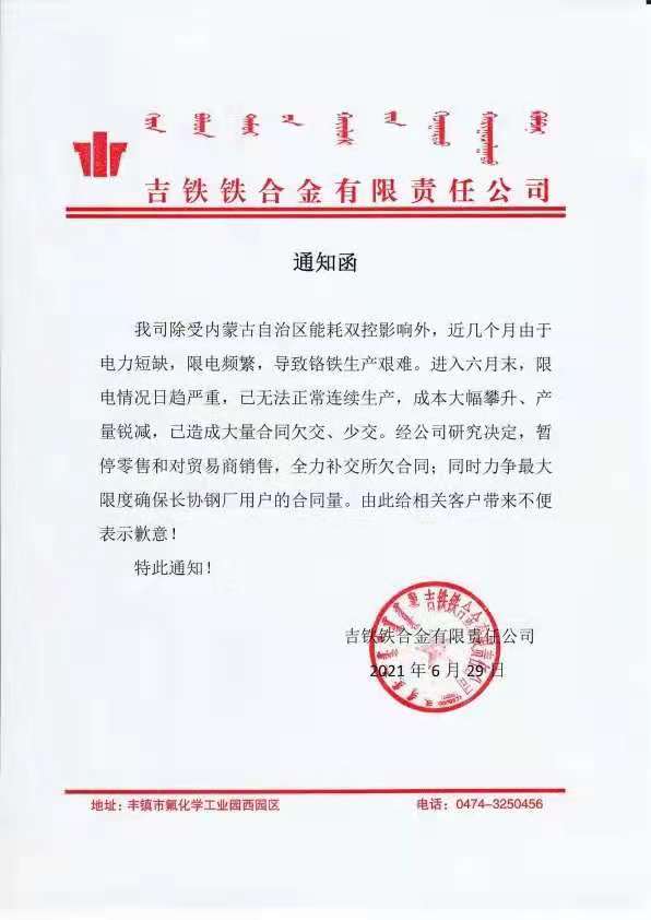 中国铁合金网讯:吉铁铁合金有限责任公司暂停铬铁零售和对贸易商销售