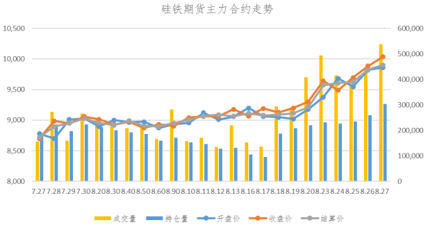本周硅铁期货盘面大幅攀升,2109主力合约周开盘价9,542,最高价10,326,最低价9,478,收盘价10,290,结算价10,154,成交量120,435,持仓量21,010,涨幅9.24%。