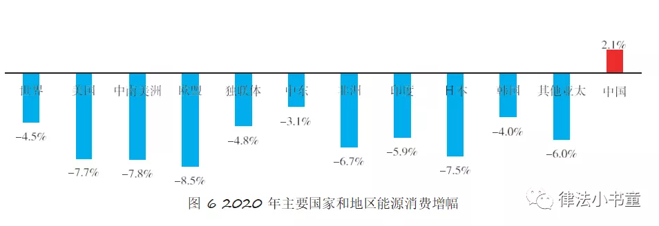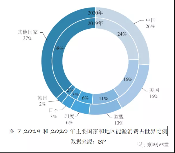 2020 年,美国、欧盟、日本等发达国家和地区能源消费下降明显,同比分别下降7.7%、8.5% 和 7.5%。中国能源消费上涨 2.1%,占全球比例由 2019 年的 24% 上升至 2020 年的 26%。
