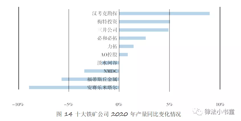 由于全球大型铁矿区多为露天矿场,所以受疫情影响较小,2020 年全球大型铁矿公司生产情况基本维持稳定,大型铁矿公司年产量变化多在 ±5% 区间波动,十大铁矿公司合计总产量与 2019 年基本持平。产量增加的公司主要得益于新项目的投产与扩产,产量减小的公司主要受困于自然灾害等因素。