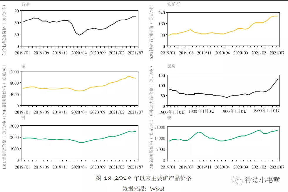 疫情初期,全球矿产品价格出现大幅下跌。中国疫情得到控制后,快速复工复产,带动全球资源需求增长,而南非、秘鲁等矿业国家疫情严重,造成煤炭、铁、铜等多种矿产出现供不应求。同时,美国等发达国家为缓解经济下行压力,出台货币量化宽松政策,美元贬值。全球矿产资源供不应求叠加美元贬值、市场炒作等因素,部分矿产品价格急剧攀升,全球动力煤价格最高达到 160 美元 / 吨,铁矿石价格高达 230 美元 / 吨,均出现历史最高价位。