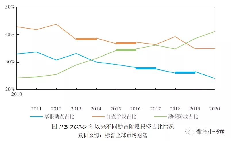近 10 年来,初级勘查阶段投入占比从 34% 持续下降至 24%,详查阶段投入占比从 43% 下降至 35%,勘探阶段投入占比从 24% 上升至 42%。2020 年,受疫情影响,初级勘查阶段投入加速下降,详查阶段勘查投入略有下降,勘探阶段勘查投入占比大幅增长。