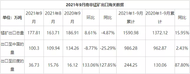 2021年1-9月南非锰矿出口量累计1590.98万吨,同比增长15.95%。其中出口到中国的数量为986.28万吨,同比增长2.43%;出口至印度的锰矿为244.25万吨,同比增长87.8%。