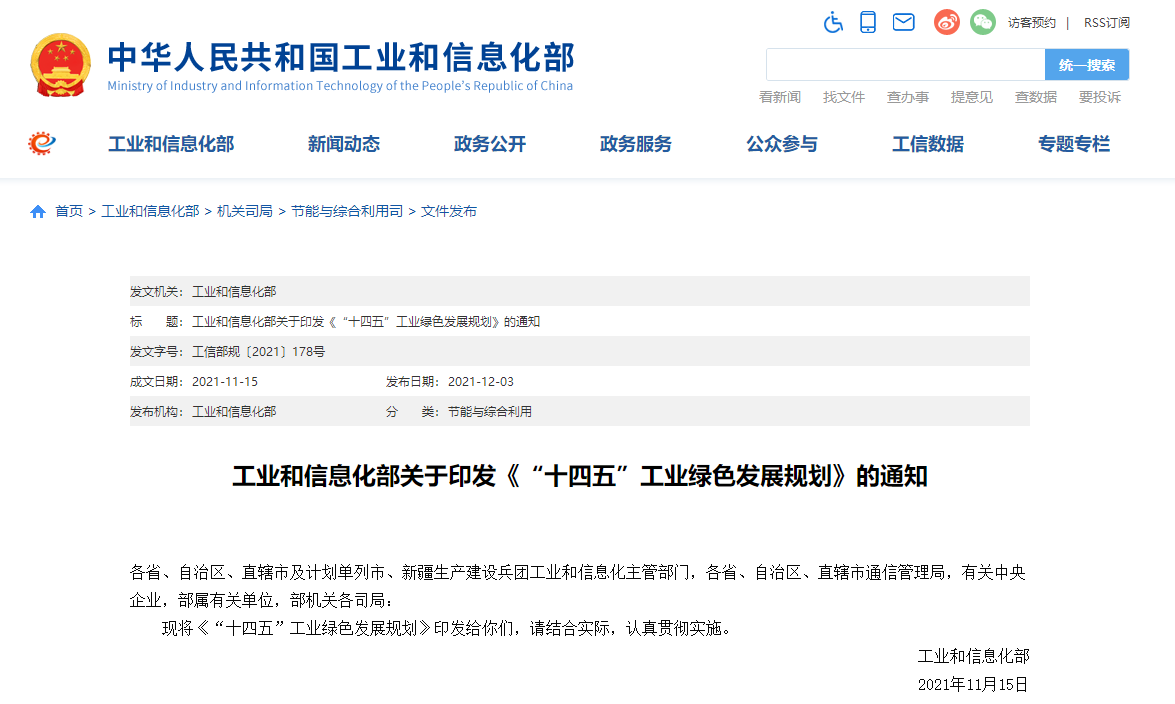 工业和信息化部关于印发《“十四五”工业绿色发展规划》的通知