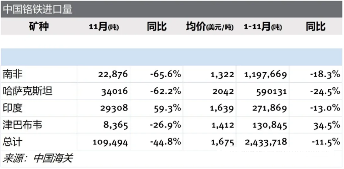 1-11月中国高碳铬铁进口同比下降11.5%,来自南非和哈萨克斯坦的出货量降幅均在20%左右。