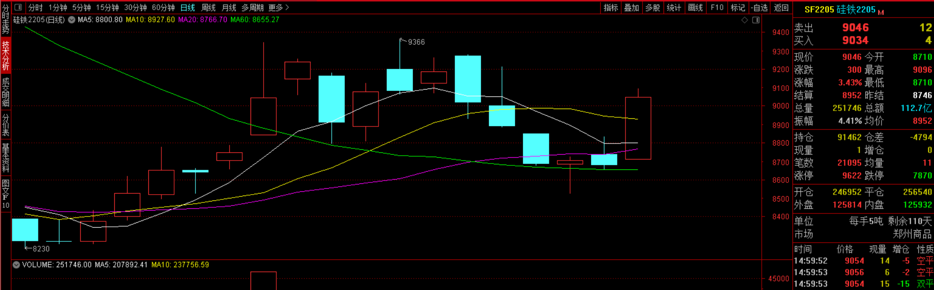 【期货走势】1月硅铁期货2205主力合约震荡中攀升,月开盘价8386,最高价9366,最低价8230,收盘价9046,结算价8952,成交量4299700,持仓量91462,涨幅7.84%。