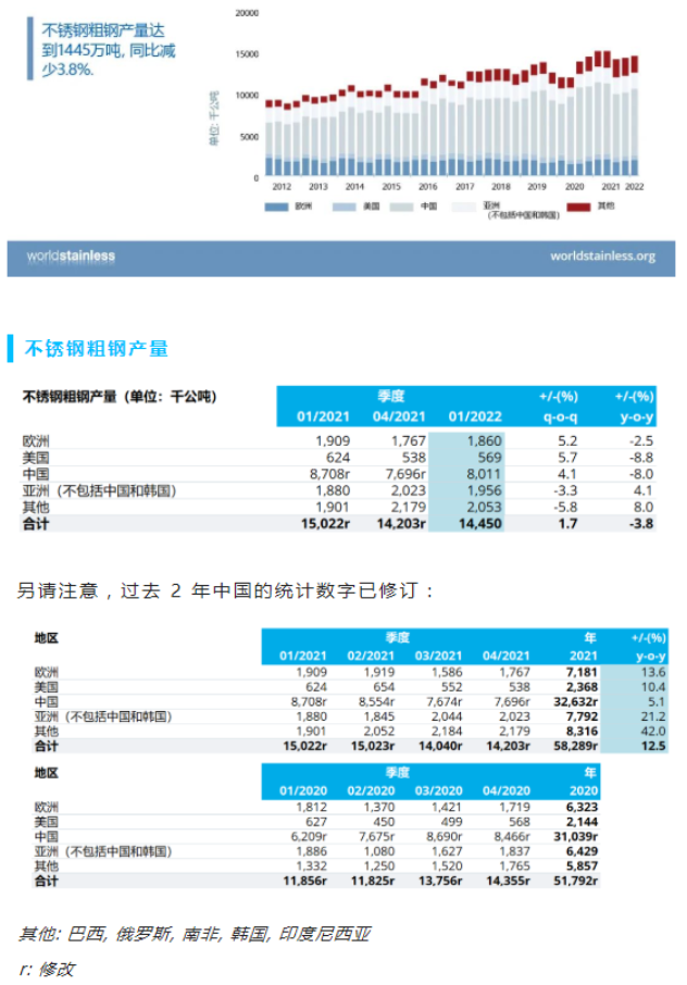 6月20日,据世界钢铁协会消息,2022年第一季度全球不锈钢粗钢产量达到1445万吨,同比减少3.8%。