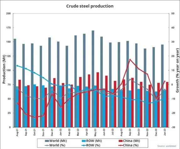 中国铁合金网:2023年2月全球63个纳入世界钢铁协会统计国家的粗钢产量为1.424亿吨,同比下降1.0%。