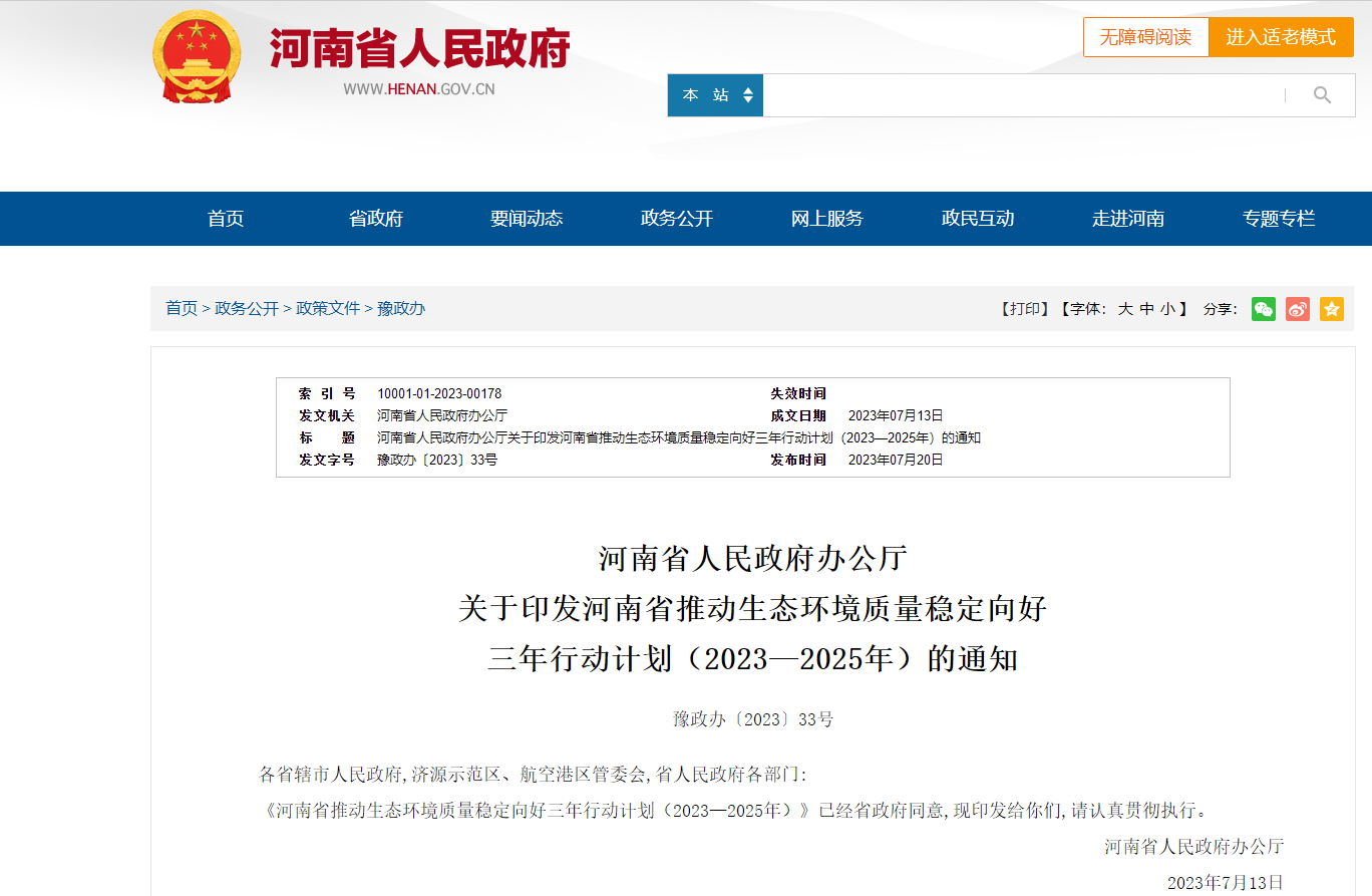 《河南省推动生态环境质量稳定向好三年行动计划(2023—2025年)》已经省政府同意,现印发给你们,请认真贯彻执行。