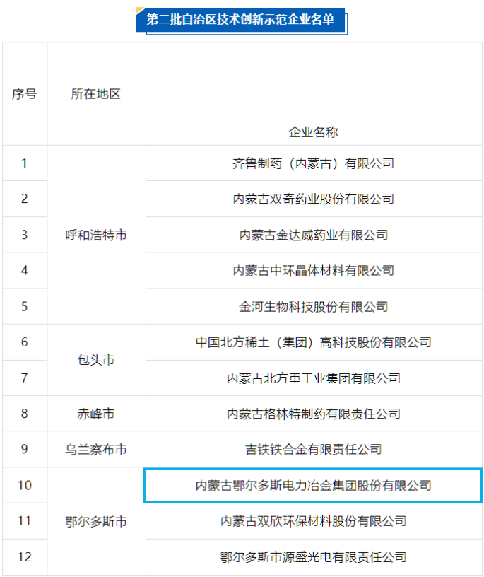 中国铁合金网:近日,内蒙古自治区工业和信息化厅公布了第二批自治区技术创新示范企业名单,共认定12家企业为第二批自治区技术创新示范企业,其中,鄂尔多斯电力冶金集团股份有限公司被认定为“内蒙古自治区技术创新示范企业”。