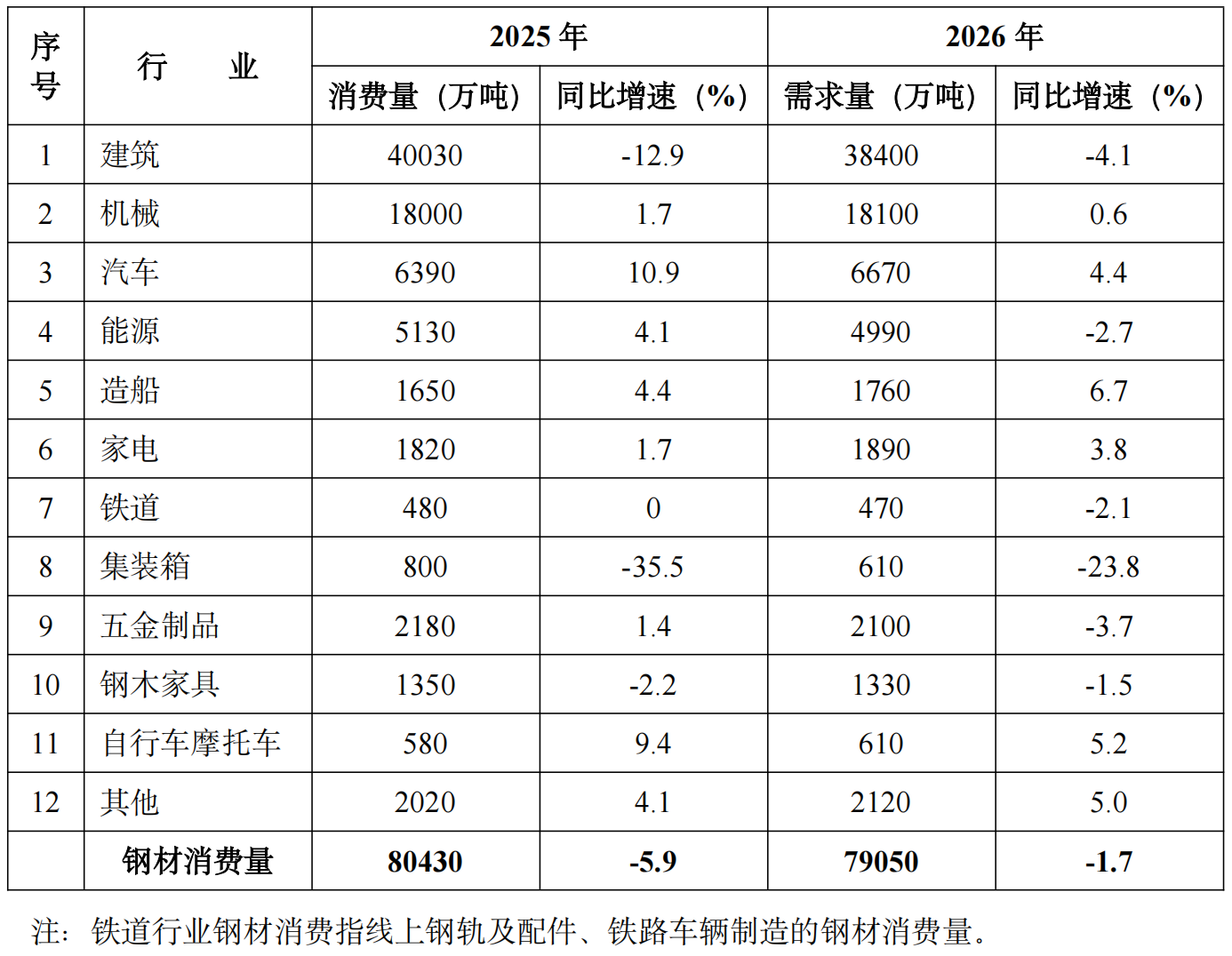2026年,我国将持续扩大内需,继续实施更加积极的财政政策和适度宽松的货币政策,打好政策“组合拳”,为钢材需求总体稳定提供有效支撑。预测2026年汽车、造船、家电、自行车摩托车等行业钢材需求呈增长态势,建筑、集装箱、五金制品等行业钢材需求下降,综合预测2026年我国钢材需求量将小幅下降。2025年和2026年各行业钢材需求预测见表1。