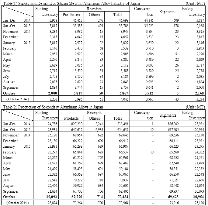 中国铁合金网讯:一方面再生铝产品的产量正在恢复,金属硅的消费量在不断增加。另一方面,二次铝合金产品的发货量环比下降,使得汽车行业的停滞,导致月末库存增加。通常日本汽车业在10月份到12月份市场疲软,因此导致铝产品出货量减少。 |