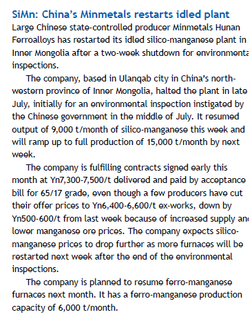 中国铁合金网讯:在环保检查期间,五矿湖铁内蒙工厂停产了两周,现在重新开始生产硅锰产品。 五矿湖铁内蒙工厂位于内蒙古乌兰察布市,在7月底因为环保检查停产。本周复产后的产量是每月9000吨,预计到下周,恢复满负荷生产,每月产量达到15000吨。 当前这家公司按照8月初的订单... |