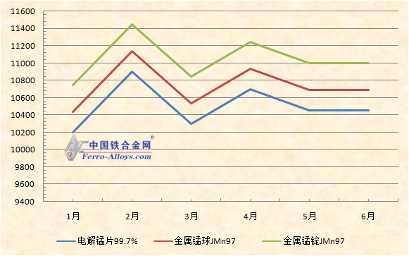 上周末,电解锰片99.7%国内主产区价格在10300-10500元/吨。今日,电解锰市场价格继续上调,目前报价在10400-10600元/吨。 |