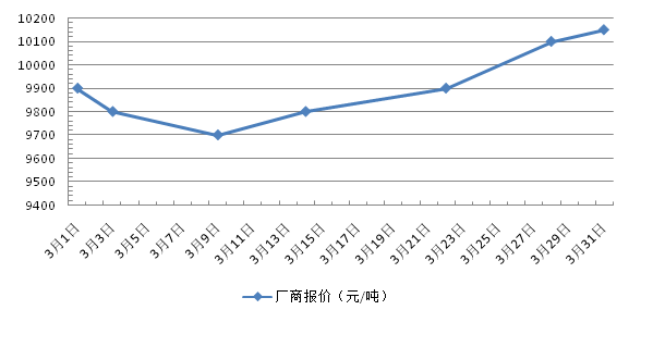 2016年3月,电解锰出厂价格呈下降-上升趋势。月初,厂商报价在9800-10000元/吨,中旬降至9600-9800元/吨,月底上升至10000-10300元/吨。 |