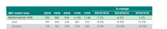 锰矿:淡水河谷2016年第二季度锰矿总产量环比下降7.3%