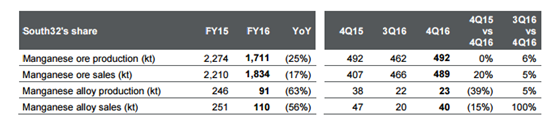 锰矿:South 32公司2016年第二季度锰矿总产量环比减少2.1%