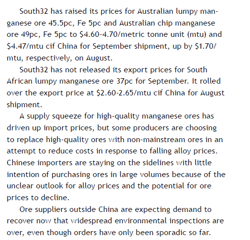 锰矿:澳大利亚South32公司提高9月锰矿出口价格