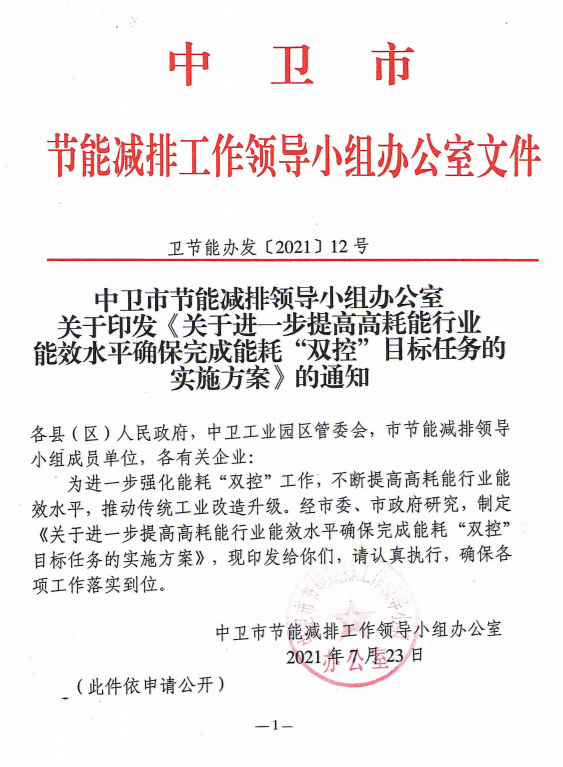 中卫市关于印发《关于进一步提高高耗能行业能耗水平确保完成能耗“双控”目标任务的实施方案》的通知。 |