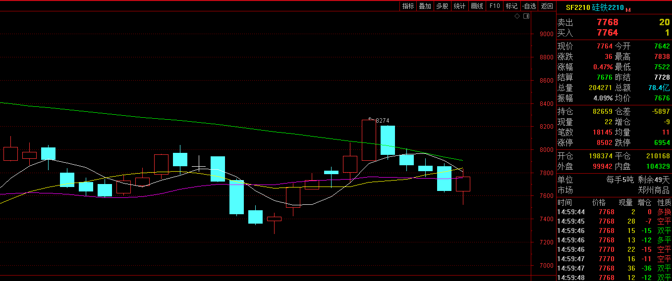 6月2209合约开盘价9,140,最高价10,068,最低价8,132,收盘价8,378,结算价8,422。 |