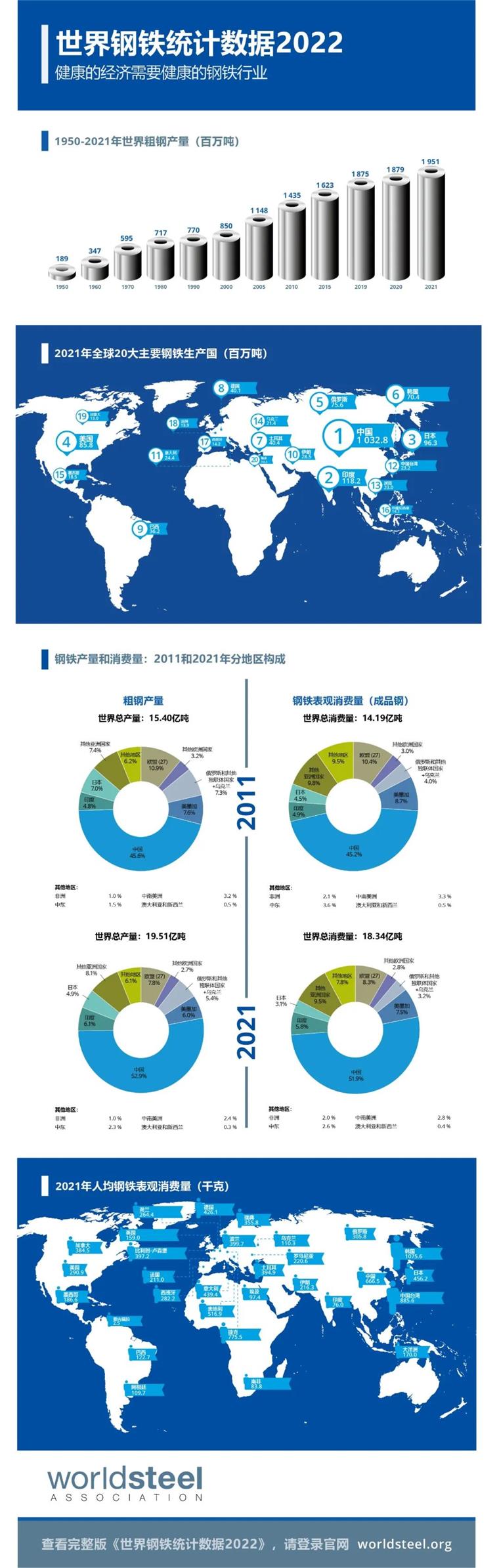 6月7日,世界钢铁协会发布《世界钢铁统计数据2022》,该手册通过钢铁产量、钢铁表观消费、全球钢铁贸易量、铁矿石产量及贸易量等主要指标介绍钢铁行业整体发展情况。 |