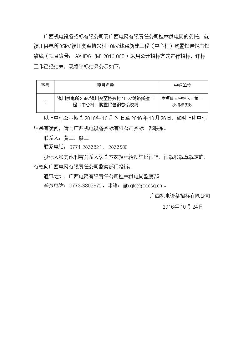 中国铁合金网讯:广西机电设备招标有限公司受广西电网有限责任公司桂林供电局的委托就漠川供电所35KV漠川变至协兴村10KV线路新建工程(中心村)购置铝包钢芯线(项目编号:GXJDGL(M)-2016-005)采用公开招标方式进行招标,评标工作已经结束,现将评标结果公示如下: |