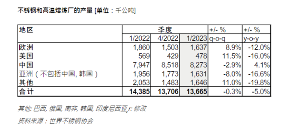 2023年7月10日,世界不锈钢协会发布了2023年前三个月的全球不锈钢产量数据,显示不锈钢粗钢产量达到1366万吨,同比下降5.0%。