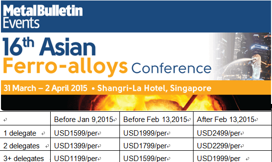 [Ferro-alloys.com]16th Asian Ferro-alloys Conference will be held in Shangri_La Hotel, Singapore on Mar 31st-Apr 2nd, 2015. Ferro-Alloys.com, as one of the conference partner, can also handle the conference registration. Attendees can enjoy the favourable price by registering conference via Ferro-Alloys.com. Register the conference via Ferro-Alloys.com, please contact withMs Yue, Tel: 86-10-85597987-826 wechat:Hillrainy Email:yueleilei@ferro-alloys.com conference@ferro-alloys.com Skype: ferroalloy_mo
