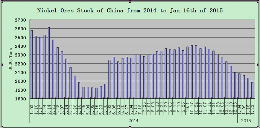 [Ferro-alloys.com]According to the statistics, on Jan.23rd, 2015, total nickel ores stock of China was 19.85million tons, decreased by 500thousand tons compared with last week. up to now, the nickel ores stock had already declined for 11 weeks with total drop volume of 4.05million tons.