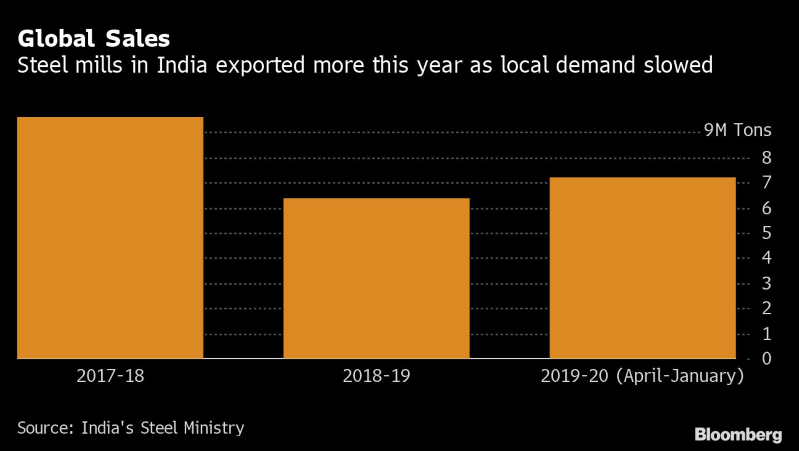 Indian mills have been shipping out more steel this year as domestic demand remains sluggish amid the slowest economic expansion in more than six years. India’s exports of finished steel jumped 40% in the 10 months to January to 7.2 million tons, according to the Steel Ministry.