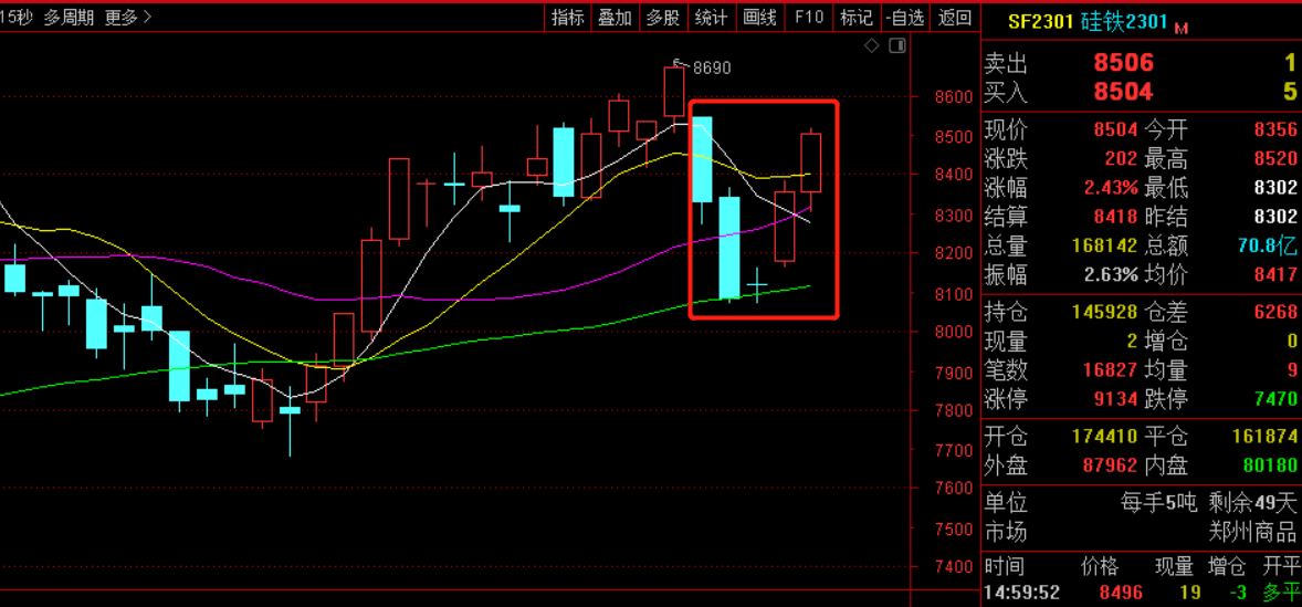 This week, the price of Ferrosilicon Futures declined first and then rose. The opening price of 2301 main contract was 8,546, the highest price was 8,546, the lowest price was 8,070, the closing price was 8,504, the settlement price was 8,418, the trading volume was 1,127,212, and the position was 145,928, down 1.25%.