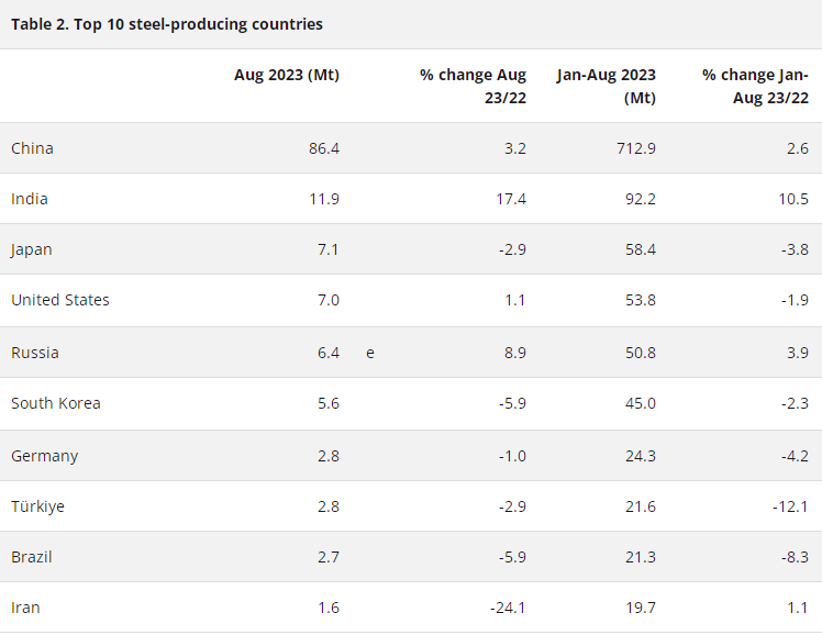 China produced 86.4 Mt in August 2023, up 3.2% on August 2022. India produced 11.9 Mt, up 17.4%. Japan produced 7.1 Mt, down 2.9%. The United States produced 7.0 Mt, up 1.1%. Russia is estimated to have produced 6.4 Mt, up 8.9%. South Korea produced 5.6 Mt, down 5.9%. Germany produced 2.8 Mt, down 1.0%. Türkiye produced 2.8 Mt, down 2.9%. Brazil produced 2.7 Mt, down 5.9%. Iran produced 1.6 Mt, down 24.1%.