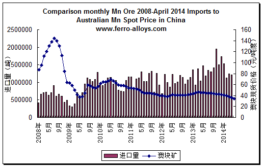 Comparison Mn Ore 2008-April 2014 imports with Australian Mn Lump Spot Price in China |