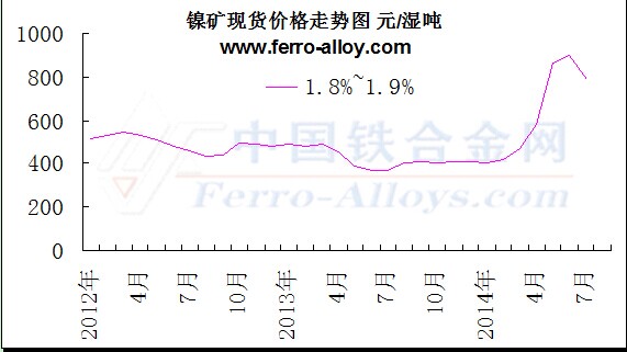 中国铁合金网讯:2012年和2013年镍矿价格一直处于弱势运行状态,并且在2013年二季度末跌至较低水平,在底部徘徊了半年之久之后,受2014年1月份印尼开始执行的原矿出口禁令影响,价格开始逐渐反弹。2014年上半年,中国高品位镍矿市场一直呈现上扬趋势,且涨势较快,以高品位镍矿1.8%为例,截至6月份,其月均价累计涨幅至少达500元/湿吨。不过进入7月份之后,涨势被逆转,因下游承受能力以及市场供应量制约,价格开始走跌,单月跌幅约110元/湿吨。