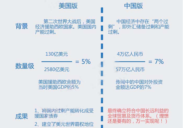 借鉴美国通过“马歇尔计划”与西欧国家双赢的先例,中国推行“一带一路”将提升境外直接投资,开辟海外市场,扩大产品出口,消化过剩产能,破除贸易壁垒,最终确立符合中国长远利益的全球贸易及货币体系。