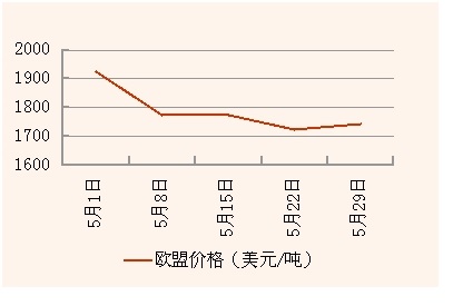 5月上旬,电解锰欧盟市场价格呈现递减的趋势,从月初的1900-1950美元/吨降至1700-1750美元/吨;下旬欧盟价格开始出现反弹,略有增长。从1700-1750美元/吨增长至月底的1720-1770美元/吨,增幅不大。