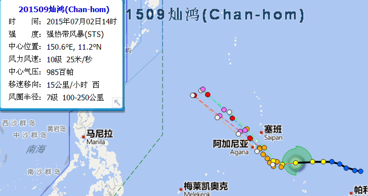 中央气象台7月2日消息,今年第9号台风“灿鸿”已于昨天(2日)凌晨加强为强热带风暴级,早晨5点钟其中心位于美国关岛东偏南方大约970公里的西北太平洋洋面上,就是北纬11.3度、东经153.4度,中心附近最大风力有10级(25米/秒),中心最低气压为985百帕,7级风圈半径120-300公里。预计,“灿鸿”将以每小时20-25公里的速度向偏西方向移动,强度继续加强。“灿鸿”未来可能会影响菲律宾海域。