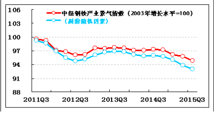 中国铁合金网讯:2015年三季度,中经钢铁产业景气指数为94.9(2003年增长水平=100),较上季度下降0.9点。钢铁行业景气度继续走低。在构成中经钢铁产业景气指数的6个指标中(仅剔除季节因素④,保留随机因素⑤),与上季度相比,全部指标包括利润总额、税金总额、主营业务收入、出口额、从业人数和固定资产投资总额增速均有所下降。进一步剔除随机因素后,中经钢铁产业景气指数为93.0(见景气走势图中的蓝色曲线),较上季度下降1.2点,比未剔除随机因素的景气指数(见红色曲线)低1.9点。