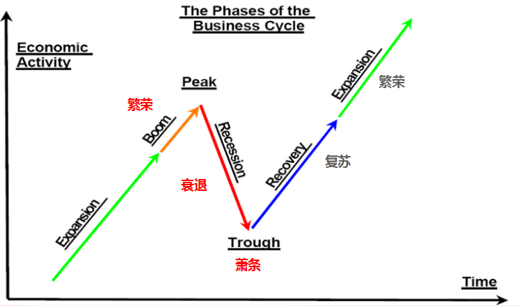 (一)经济周期包括四个阶段 :衰退、萧条、复苏和繁荣。2015年就是衰退的开始,本轮经济调整,中国经济连续4个季度都出现下滑。预计2015年GDP增长率为6.9%。主要表现的特征为大宗原材料价格下跌,原油价格暴跌开始,所有的大宗商品包括石油,大金属,铁矿石,煤炭,钢铁价格下跌。从行业特征来看,就是产能严重过剩,需求不足,企业利润大幅下滑和亏损,中小企业倒闭,制造业受到严重打击。凸显出各行各业严重衰退的危机。衰退是经济周期的决定性阶段,是上一个经济周期的终点,也是下一个经济周期的起点。危机之后是萧条阶段。