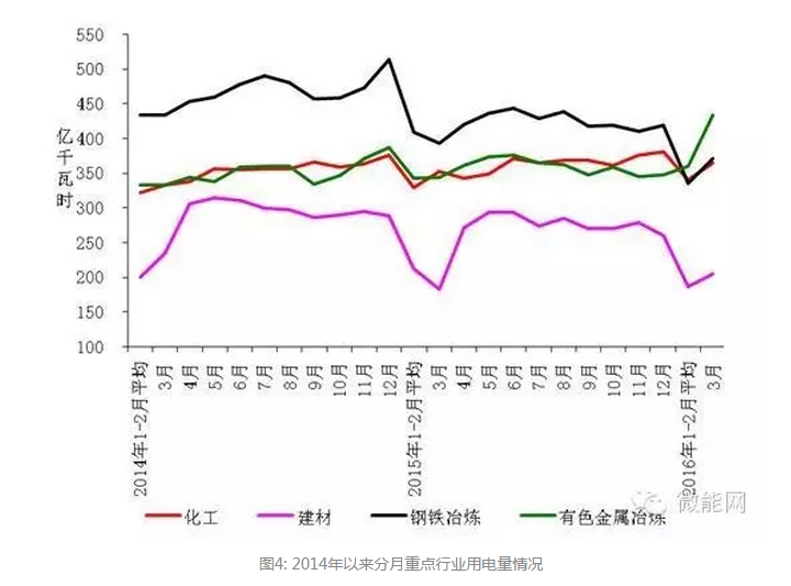 1-3月份,化学原料制品、非金属矿物制品、黑色金属冶炼和有色金属冶炼四大高载能行业用电量合计3816亿千瓦时,同比下降5.8%,增速比上年同期回落4.5个百分点;合计用电量占全社会用电量的比重为28.2%,对全社会用电量增长的贡献率为-55.0%。其中,化工行业用电量1044亿千瓦时,同比增长3.4%,增速比上年同期回落0.2个百分点;建材行业用电量578亿千瓦时,同比下降4.7%,增速比上年同期回落0.2个百分点;黑色金属冶炼行业用电量1042亿千瓦时,同比下降14.0%,增速比上年同期回落7.2个百分点;有色金属冶炼行业1152亿千瓦时,同比下降5.7%,增速比上年同期回落8.8个百分点。