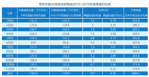 “正常情况下(不受限电影响),10兆瓦单晶硅光伏方阵2013~2015年3年发电量较10兆瓦多晶硅光伏方阵发电量增加78.2万千瓦时,单晶硅较多晶硅发电量可高出4.58%。”近日,一组青海格尔木20兆瓦光伏电站的运行数据出炉,由组件差异决定的光伏电站系统效率的提升得出的结论。