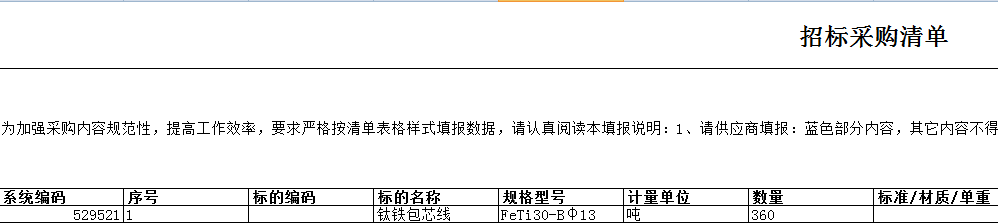 供应部就钛铁包芯线在招标中心进行招标采购,现邀请合格投标人进行网上电子投标。