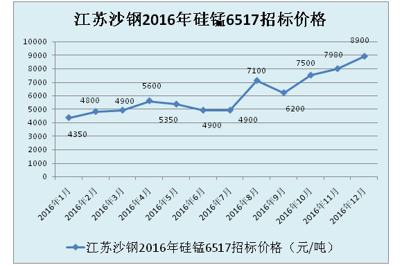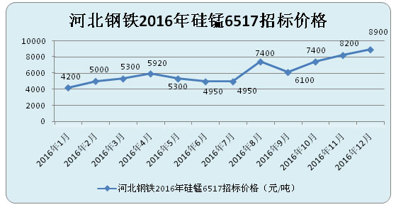 中国铁合金网讯:2016年国内硅锰价格“三起三落”,但上涨的多,回落的少,总趋势维持上行的势头,2016年初,硅锰主流价格为3800元/吨,到2016年底,硅锰主流价格为8200元/吨。